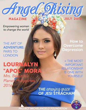 This 1st anniversary celebration, we present you with our July/Summer 2016 issue in the themes of single motherhood, travel, and overcoming difficult challenges. On the cover is single mom beauty queen Lournalyn “Apol” Mora, Mrs. Queen of the Beautiful Planet, Philippines together with a poignant interview by Sheilla Habab and a very inspiring story of faith and redemption about Jesi Stracham, Miss North Carolina Wheelchair 2016 written by McKenna Leitschuck, our Angel Rising Magazine International Public Relations Officer and titleholder as Miss Nebraska International 2015. Read up on many more heartfelt stories of amazing blessings and thoughts on how to overcome depression and living life with gratitude through travels and so much more.